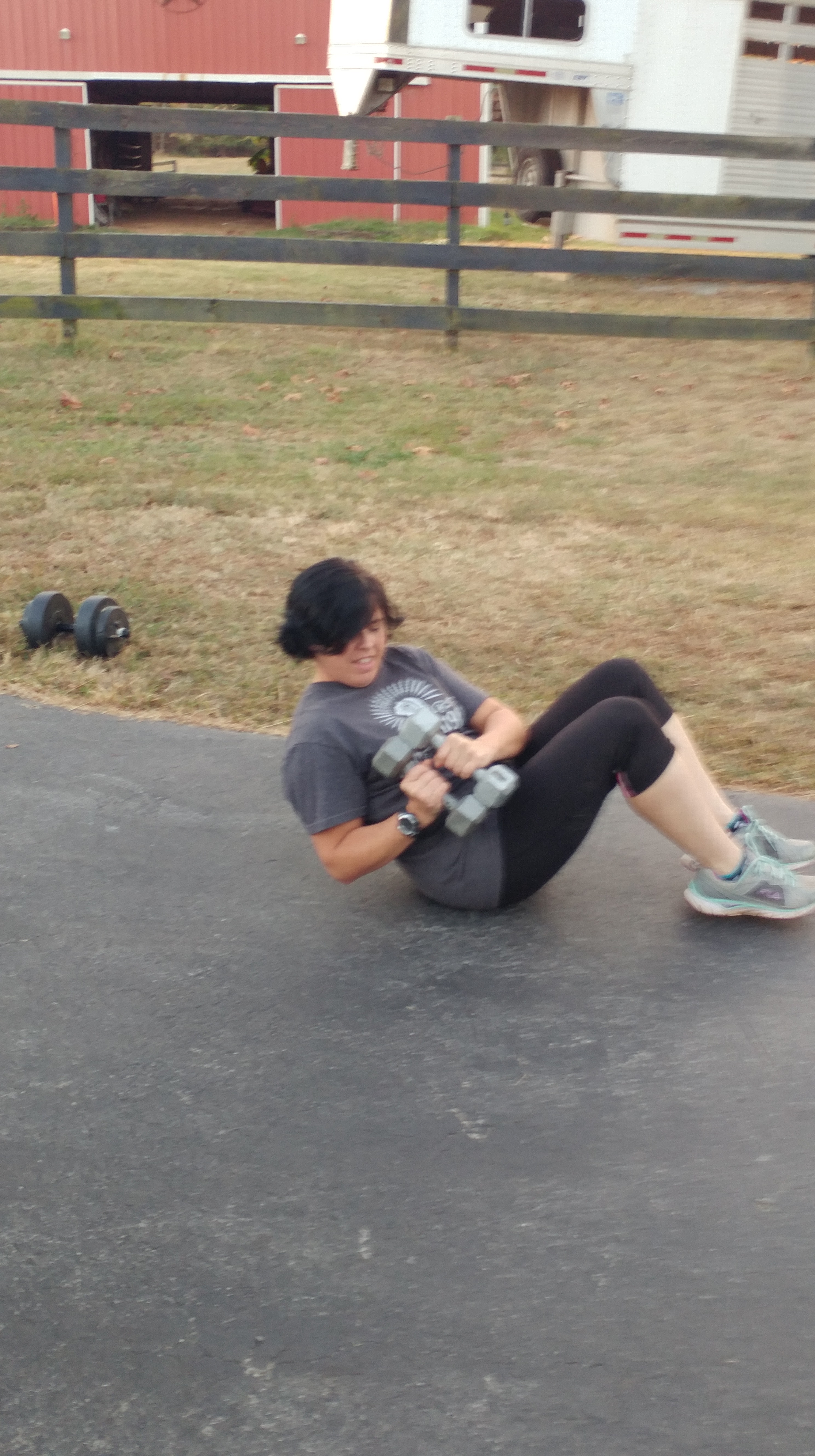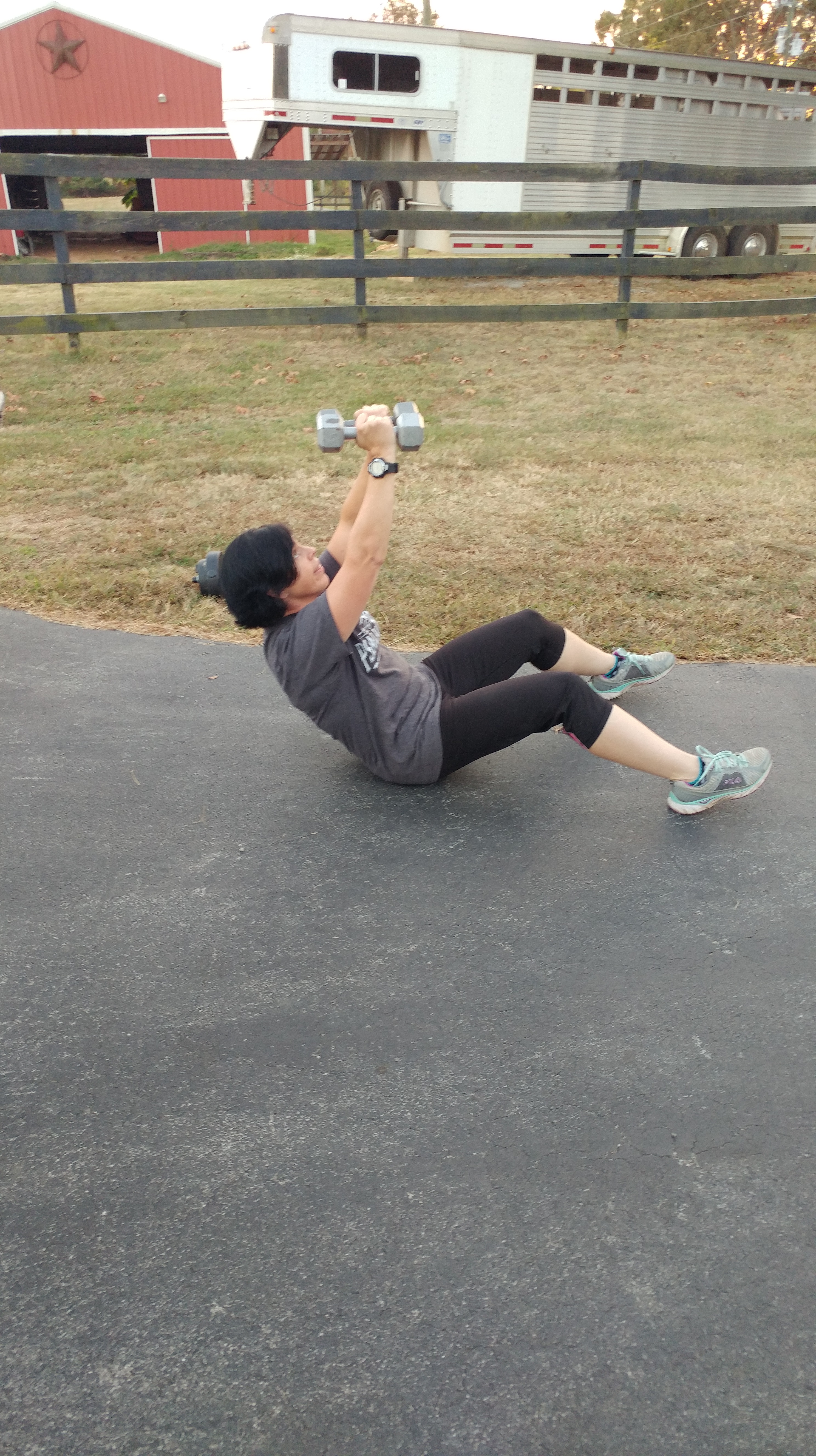 The next two exercise is a crunch with weights. I use ten pound weights. There’s two variations that I do. One is a regular crunch with the weights just above my head. The other is a crunch into a sit up where I lift the weights up above my head. Both of these exercises simultaneously work your core while you’re working your arms. Because you’re using your core to lift the weights, it’s almost like weight lifting for your core!